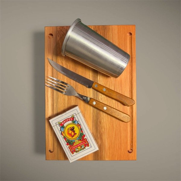 Llevá tu experiencia de asado al siguiente nivel. Este combo incluye plato de madera de eucalipto, cubiertos, vaso metálico y un juego de cartas para previa o sobremesa.