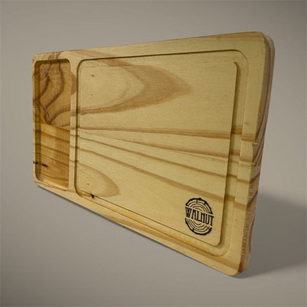 Plato de pino con sección para ensaladas o acompañamientos. Diseñada para quienes buscan funcionalidad y estética, combina un espacio separado para tus guarniciones con la superficie principal para cortar o servir.